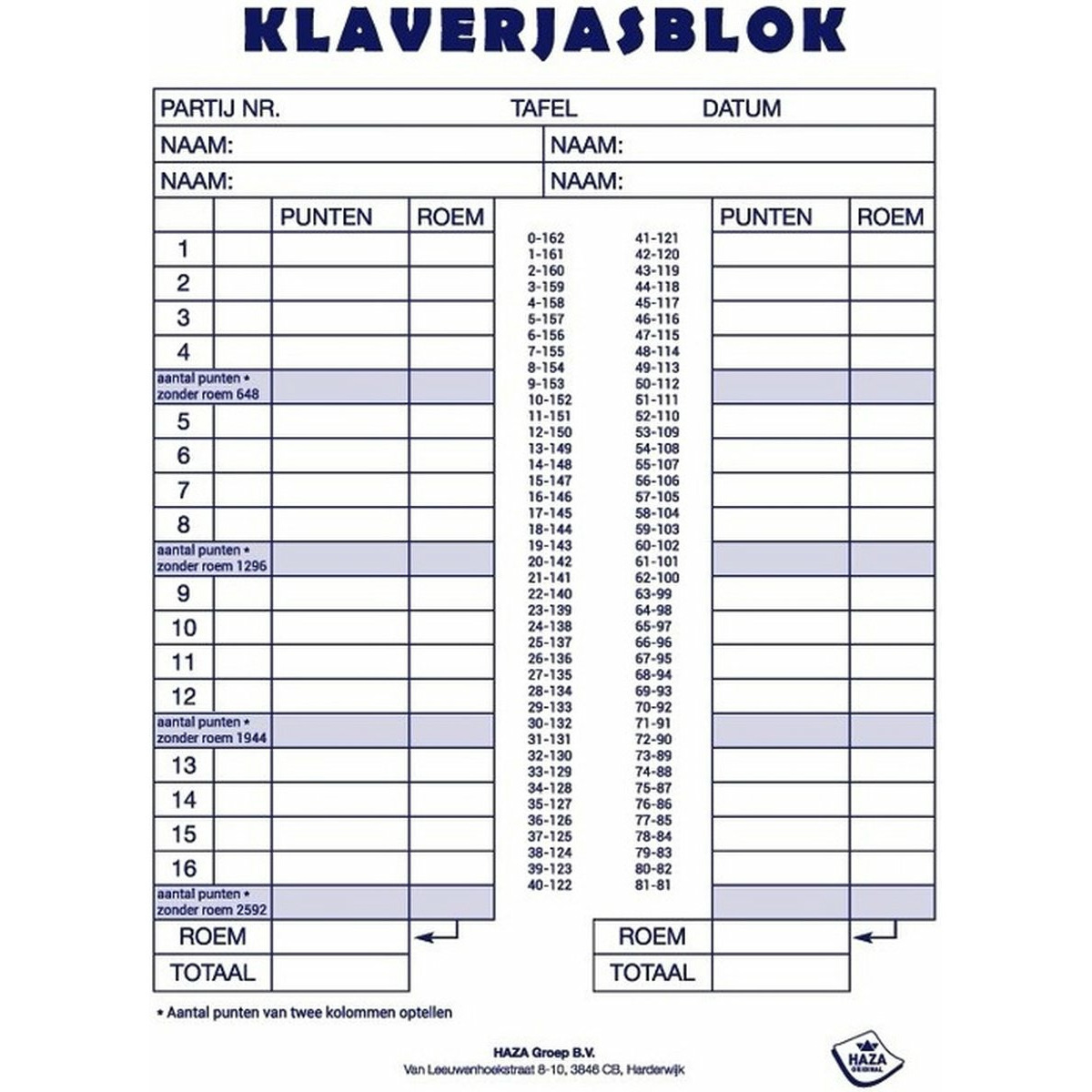 1x Klaverjassen scoreblok met 50 vellen. Scoreblok/klaverjasblok om uw punten bij te houden met het kaart spelletje Klaverjassen. Dit blok bevat 50 velletjes en heeft een formaat van ca. 14,8 x 21 cm. Materiaal: papier. Let op: dit is geen speelgoed en niet geschikt voor kinderen.