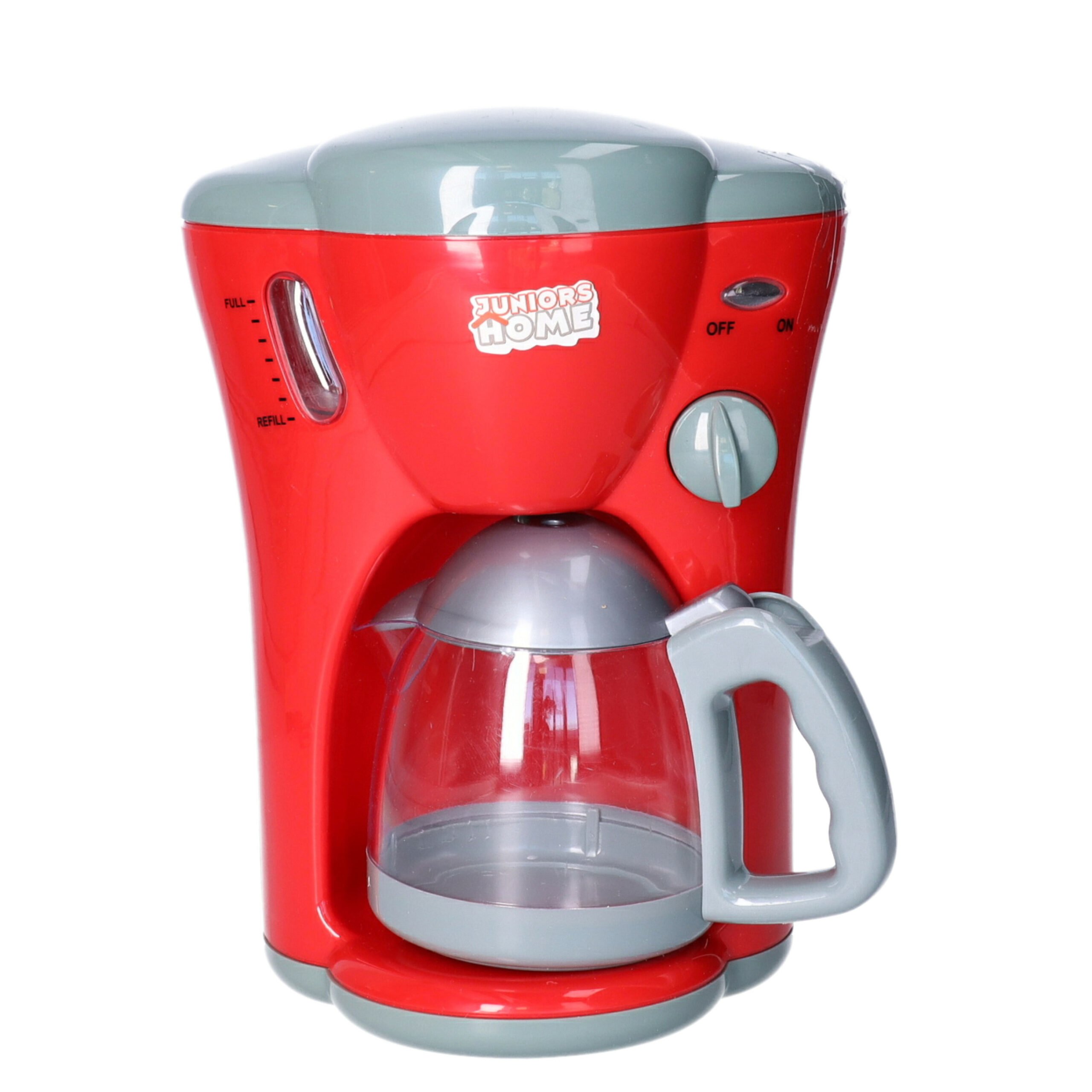 Speelgoed koffiezetapparaat keukenapparatuur voor kinderen. Wit met rode speelgoed filterkoffie apparaat keukenapparaat. Het klepje kan aan de bovenkant kan geopend worden, er kan water in gegoten worden en na het aanzetten komt het water er aan de onderkant uit en stroomt het in de koffiepot. Uiteraard zal het water niet heet worden!