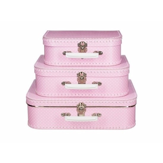 Speelgoed koffertje roze met stippen wit 25 cm. Klassiek model koffertje voor kinderen. Materiaal: stevig karton. Formaat: ongeveer 25 x 18 cm.