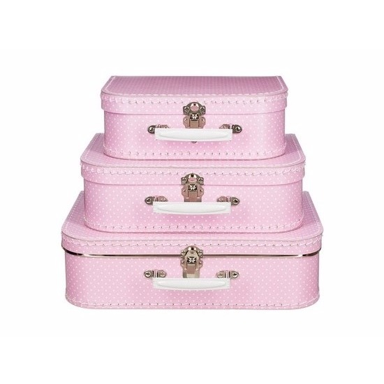 Speelgoed koffertje roze polka dot 30 cm. Klassiek model koffertje voor kinderen. Materiaal: stevig karton. Formaat: ongeveer 30 x 21 cm.