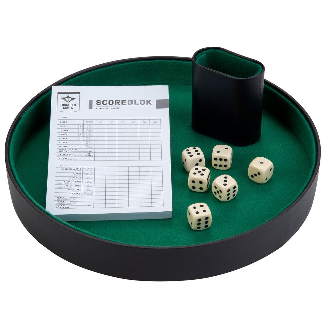 Dobbelset inclusief pokerpiste, beker, scoreblok en 6 dobbelstenen. Breng sfeer aan elke spelletjesavond met deze complete dobbelset van Longfield. De set komt in een stijlvolle groen/zwarte uitvoering en bevat alles wat je nodig hebt voor urenlang dobbelplezier. Ideaal voor zowel thuis als op vakantie!
