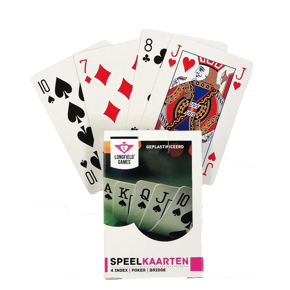 Speelkaarten van Longfield Games. Dit setje speelkaarten is perfect voor een breed scala aan kaartspellen, zoals poker, bridge, pesten, en vele andere. Het doosje bevat 54 kaarten, inclusief twee jokers, allemaal gedrukt op geplastificeerd papier voor een langdurige speelervaring. De klassieke en Engelse bedrukking, met grote index voor cijfers en letters, maakt de kaarten gemakkelijk leesbaar, zelfs van een afstand. Of je nu een doorgewinterde kaartspeler bent of gewoon een gezellige spelavond met vrienden wilt organiseren, deze speelkaarten zijn een must-have voor je collectie.