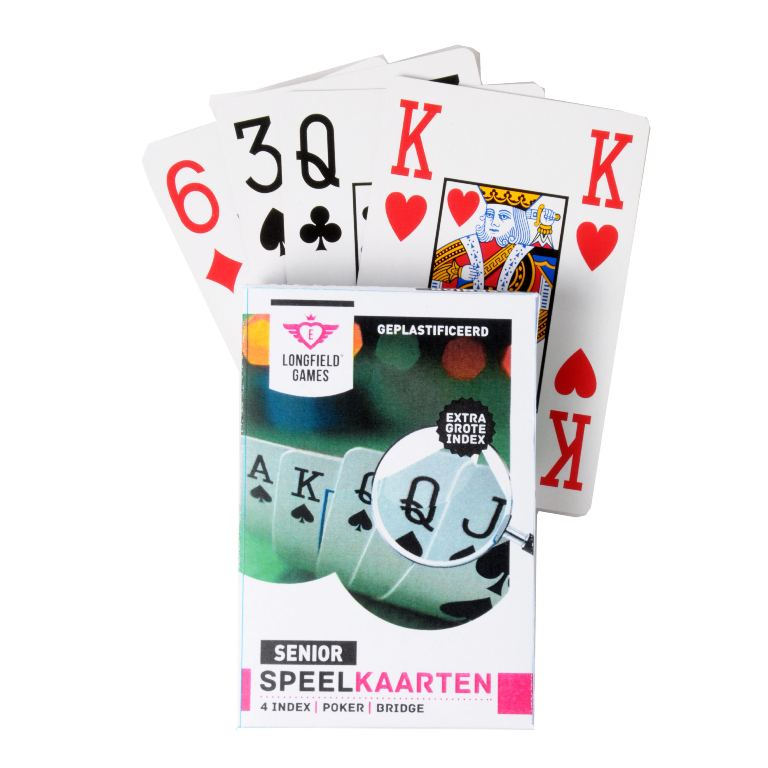 Senior speelkaarten plastic poker/bridge/kaartspel. Doosje met klassieke en Engelse bedrukking speelkaarten (K, Q, J) met grote index (cijfers en letters). Prettig voor oudere mensen of slechtzienden. LET OP: De kaarten zijn even groot als normale speelkaarten, alleen de afbeeldingen op de kaarten zijn groter.