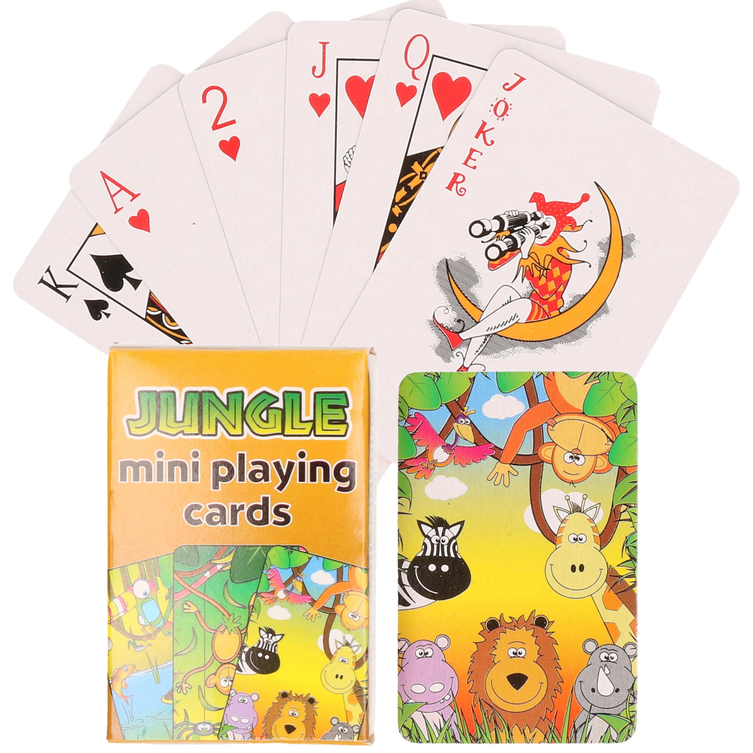 Mini jungle dieren thema speelkaarten 6 x 4 cm in doosje. Materiaal: karton. 48 kaarten per spel. Leuke kleine kaartspelletjes voor kinderen en/of volwassenen. Handig formaatje.