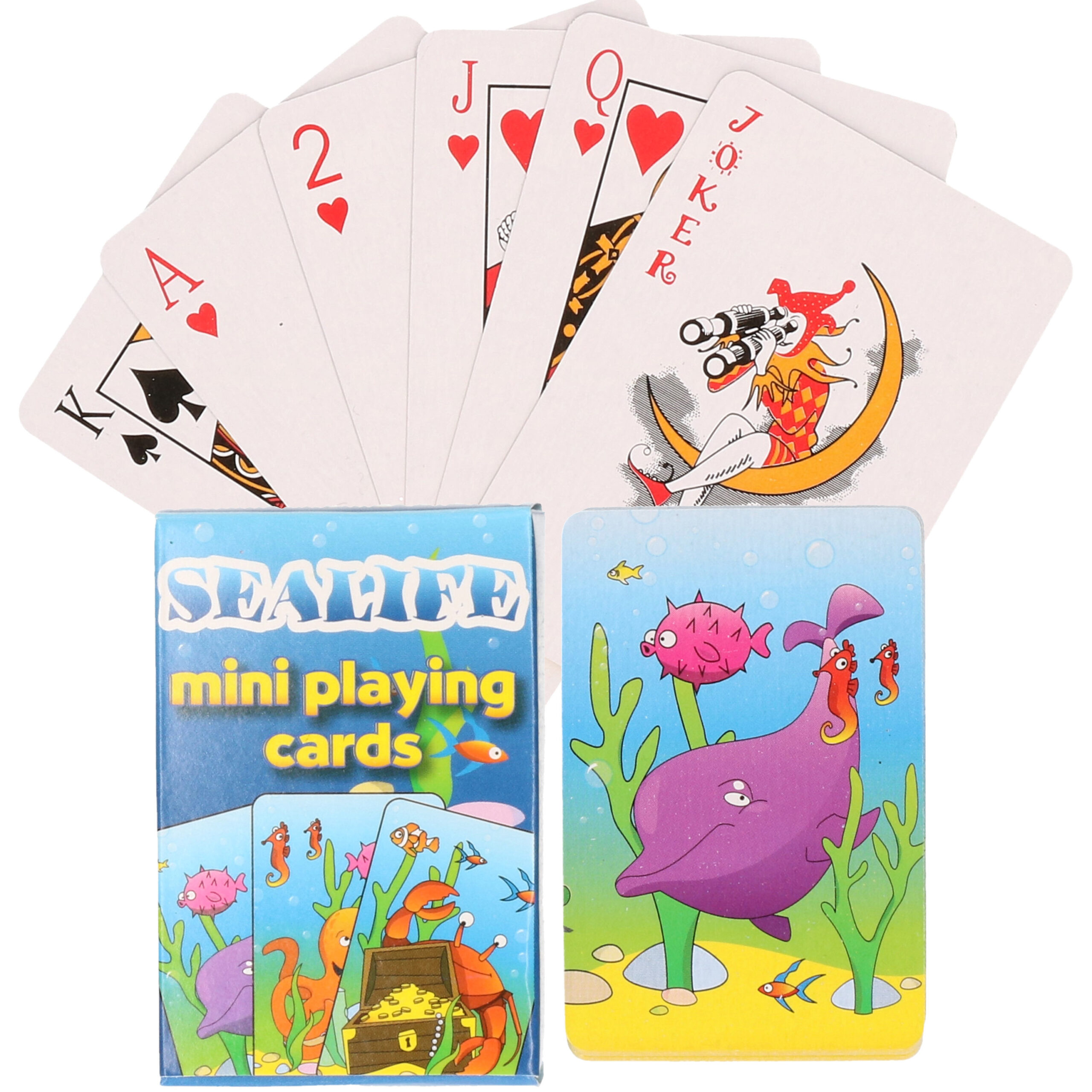Mini zeedieren thema speelkaarten 6 x 4 cm in doosje. Materiaal: karton. 54 kaarten per spel. Leuke kleine kaartspelletjes voor kinderen en/of volwassenen. Handig formaatje.