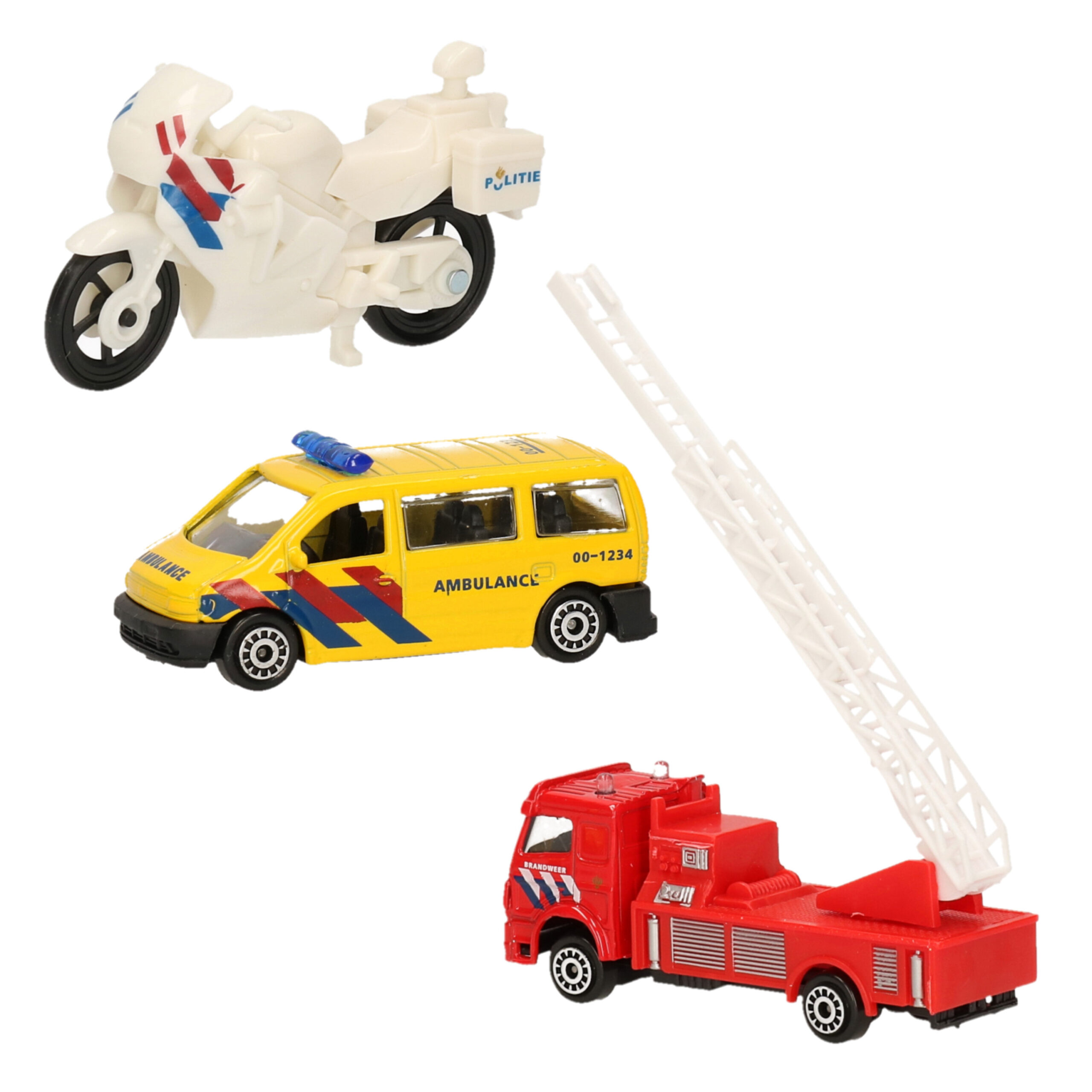 3-Delige Nederlandse politie/brandweer/ambulance speelgoedauto set. Hulpdiensten set bestaande uit een brandweerauto, politieauto en een ambulance op schaalmodel. Materiaal: die-cast metaal, plastic. Formaat voertuigen ca. 7 x 3 x 3 cm. De brandweerwagen heeft een uitschuifbare ladder.