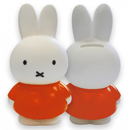 Nijntje peuters en kinderen dieren spaarpot in het oranje en wit. Kleine oranje nijntje spaarpot van ongeveer 12 cm hoog. Materiaal: melamine kunststof. Met opening.