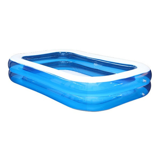Opblaasbaar rechthoekig zwembad 262 x 175 x 51 cm. Groot opblaasbaar zwembad om lekker in te dobberen tijdens de warme zomerdagen. 2 Rings rechthoekig zwembad in de kleur blauw van ongeveer 262 x 175 x 51 cm. Met een plug in de onderkant. Materiaaldikte: bovenkant ongeveer 0,30 mm, onderkant en zijkanten ongeveer 0,29 mm. Materiaal: PVC. Inclusief reparatiesetje.