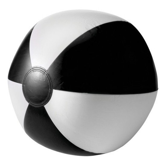 Opblaasbare speelgoed zwembad of party strandbal in de kleuren zwart/wit. De opblaasbare strandbal heeft een doorsnede van ongeveer 26 cm. Materiaal: pvc. Strandballen buiten speelgoed/strand speelgoed.