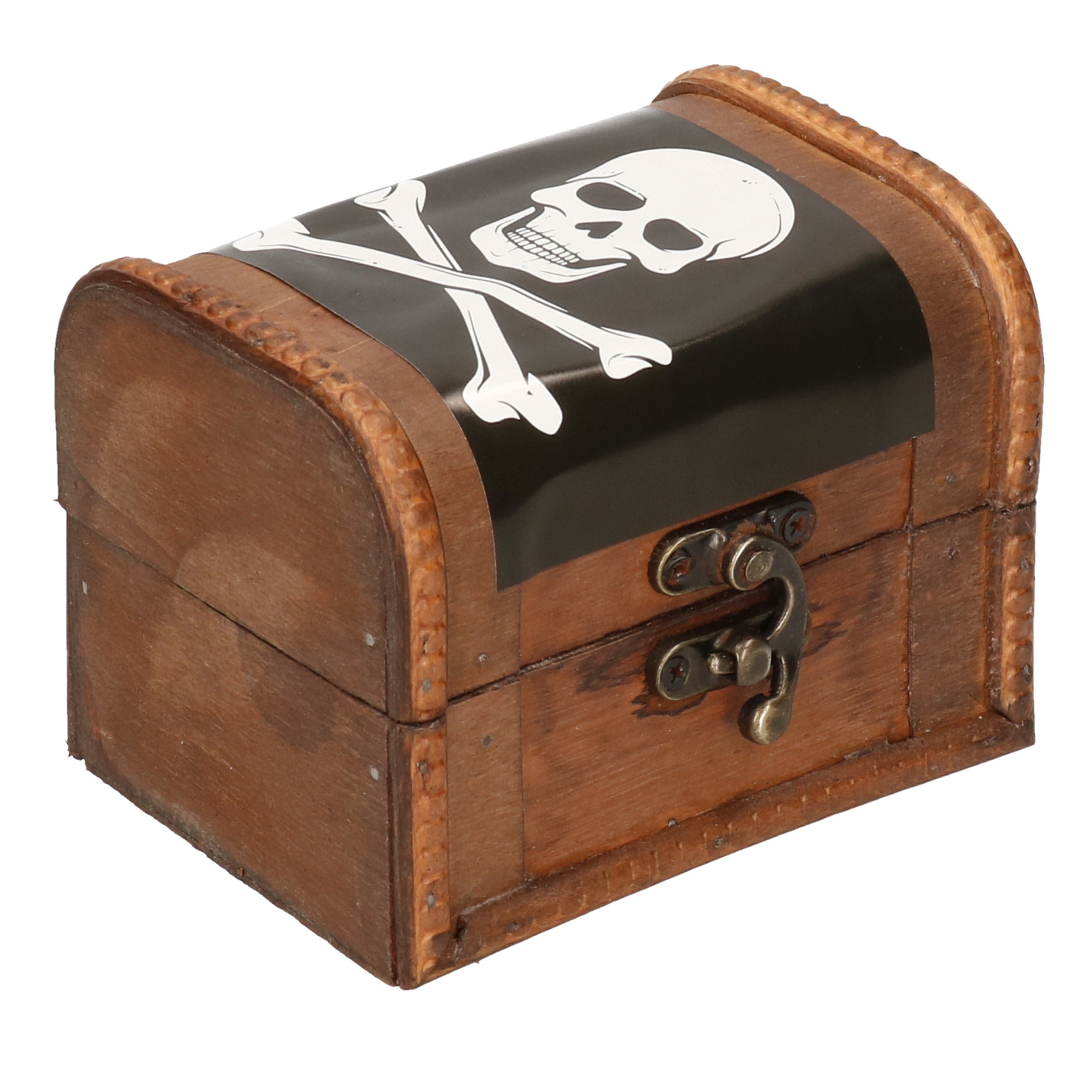 Dit piraten schatkistje heeft een afmeting van ca. 11 x 8,5 x 8,5 cm en is gemaakt van hout. De sluiting is gemaakt van metaal. U ontvangt een blanco kistje met een losse piraten sticker, welke u zelf horizontaal op het kistje kunt plakken. , Dit artikel bestaat uit:, 1x Piraten thema stickers 7.5 x 10 cm, 1x Opbergkistje – donkerbruin – 11 x 8,5 x 8,5 cm – hout/metaal – opbergdoosje – kistje
