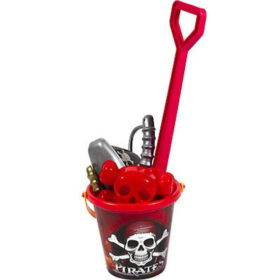 Met deze complete piraten strandemmer speelset beleven kinderen urenlang plezier in zand en op het strand. De set bevat een emmer met hengsel, een gietertje, een lang schepje, een zwaard en een doodshoofd zandvormpje. De emmer heeft een stoere opdruk van een schedel met botten en de tekst ?Pirates?.