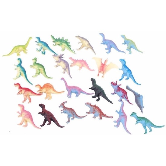 Gekleurde dinosaurussen 12x stuks. Deze speelgoed dinosaurussen hebben een grootte van ongeveer 6 cm. Materiaal: plastic/rubber. De kleuren kunnen afwijken van wat er in de verpakking zit. Dino speelgoed figuren voor kinderen.