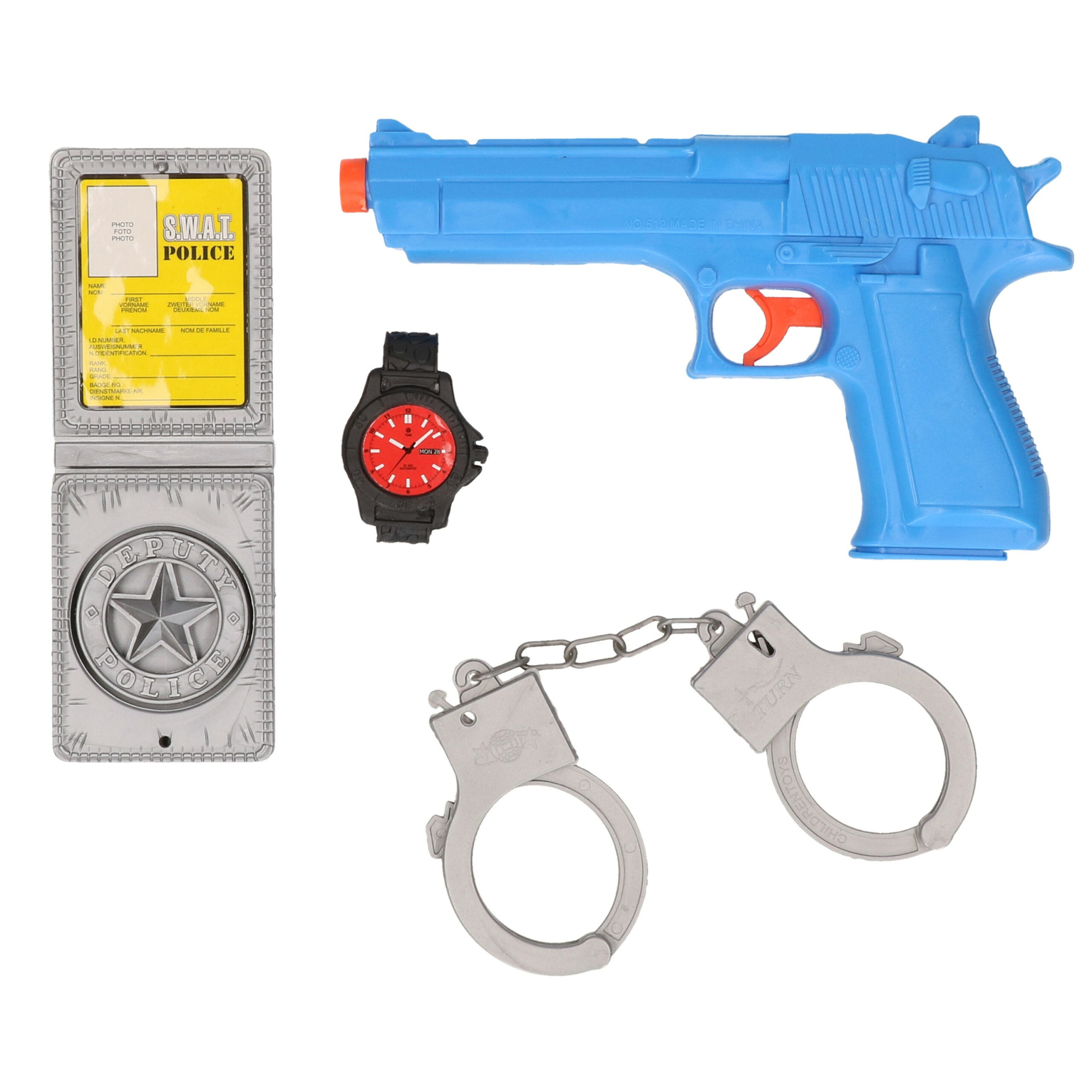 Politie of SWAT team speelgoed pistool met accessoires set. Materiaal: kunststof. Deze wapens zijn te gebruiken als speelgoed, maar tevens als bijvoorbeeld verkleed/carnaval verkleed accessoires wanneer uw kind of u verkleed gaat als SWAT team/politie/FBI. Rollenspel verkleed atributen, speelgoed wapens.