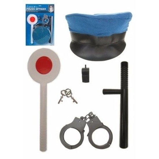 Speelgoed politie verkleed accessoires set 5 delig. Politieset bestaande uit een blauwe politiepet, stopbord, handboeien en een rubberen gummi knuppel. Voor kinderen.