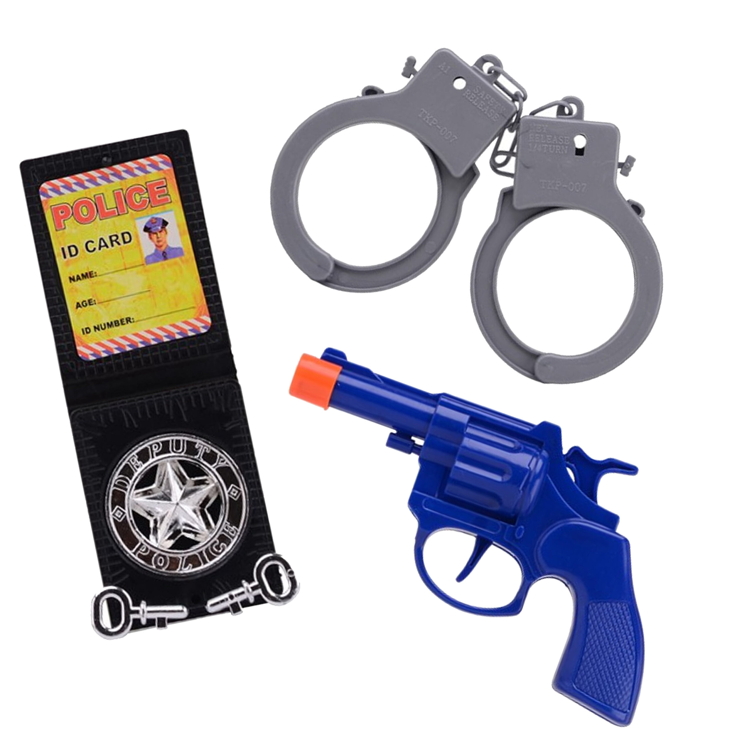 Politie speelgoed verkleedset. Met deze stoere politie verkleedset kunnen kinderen zich helemaal inleven in de rol van een echte agent! De set bevat handboeien met sleutel, een speelgoedpistool en een badge, perfect voor spannende rollenspellen en avontuurlijke achtervolgingen. Gemaakt van stevig kunststof en ideaal voor carnaval, themafeesten of gewoon lekker spelen. Laat de misdaad geen kans met dit leuke politie speelgoed!
