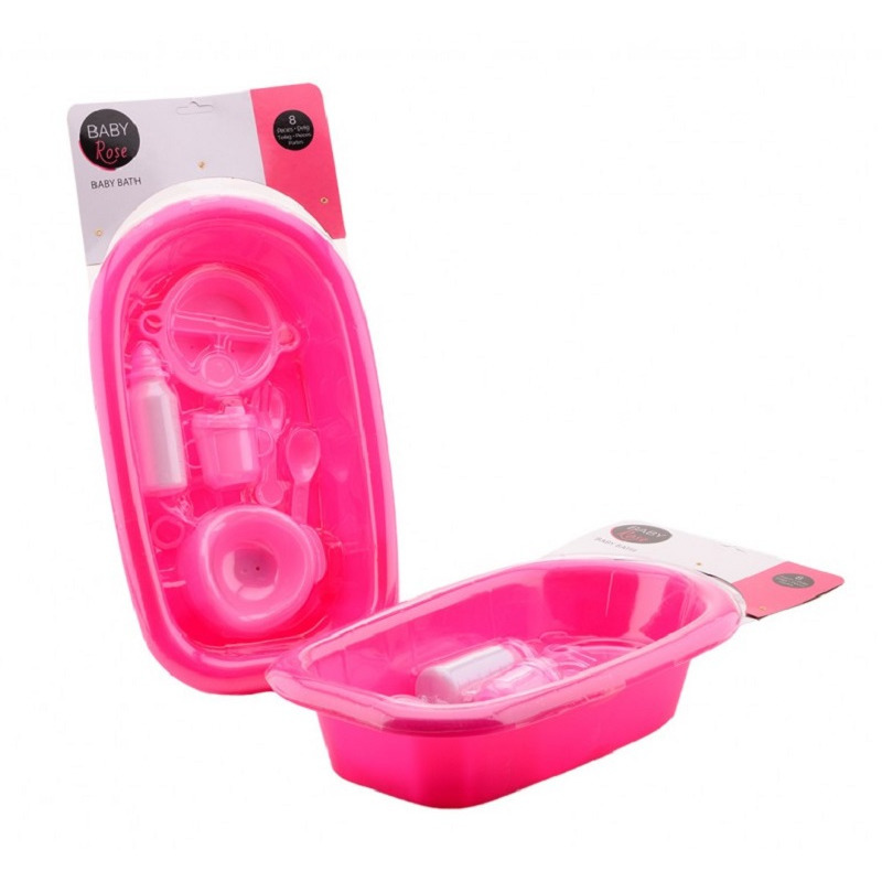 Poppen speelgoed badset 8 delig roze. Deze poppen verzorging bad accessoires set bestaat uit een roze badje, een potje, een flesje, een speentje, een bordje met bestek en een drinkbeker.
