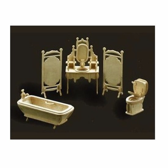 Maak je poppenhuis compleet met deze prachtige 5-delige badkamer meubeltjes set! Deze set, gemaakt van hoogwaardig hout, bestaat uit een badkuip, wastafel, toilet, en twee kamerschermen. Perfect voor creatievelingen, deze DIY bouwset biedt de mogelijkheid om de meubeltjes zelf in elkaar te zetten en eventueel naar wens te schilderen. Dankzij het duurzame hout zijn de meubeltjes stevig en gaan ze lang mee. Ideaal voor uren speelplezier en om je poppenhuis een stijlvolle, moderne badkamer te geven. Geschikt voor kinderen vanaf 6 jaar. Ongelakt. Schaal: 1 op 12.