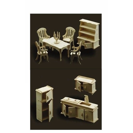 Poppenhuis meubels keuken en eetkamer bouwpakketten. Deze houten poppenhuis meubels voor de eetkamer en keuken kunt u gebruiken voor de inrichting van een poppenhuis. Geschikt vanaf 6 jaar. Ongelakt. Schaal 1:12. , Dit artikel bestaat uit:, 1x Poppenhuis meubels – eetkamer – schaal 1:12 – hout – speelgoed, 1x Poppenhuis meubels – keuken – schaal 1:12 – hout – speelgoed