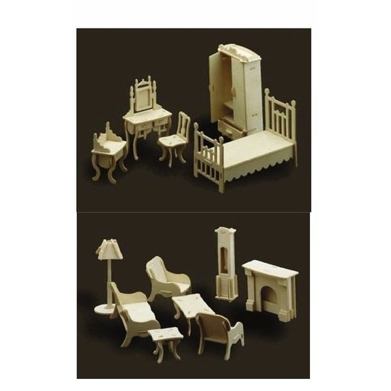 Poppenhuis meubels slaapkamer/woonkamer. Poppenkast woonkamer en slaapkamer meubeltjes. De meubels zijn van blank ongelakt hout en in klassieke stijl. Geschikt voor kinderen vanaf 6 jaar. Schaal 1:12. , Dit artikel bestaat uit:, 1x Poppenhuis meubels – slaapkamer – schaal 1:12 – hout – speelgoed, 1x Poppenhuis meubels huiskamer – hout – bouwpakket – 8x stuks inhoud