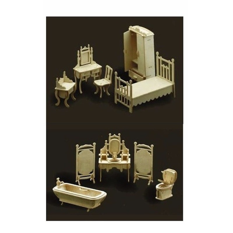 Poppenhuis slaapkamer en badkamer meubeltjes set. Houten poppenkast bouw set meubels voor een bad- en slaapkamer. De meubels zijn van blank hout, en in klassieke stijl. Geschikt voor kinderen vanaf 6 jaar. Ongelakt. Schaal 1:12. , Dit artikel bestaat uit:, 1x Poppenhuis meubels – slaapkamer – schaal 1:12 – hout – speelgoed, 1x Poppenhuis badkamer meubeltjes set – hout – 5-delig – DIY bouwset