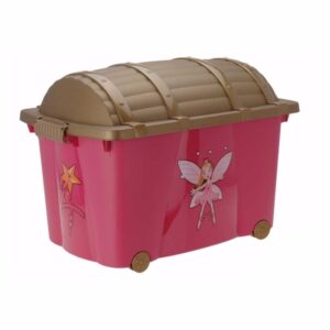 Prinsessen schatkist. Deze roze met gouden schatkist met een prinsessen opdruk heeft een afmeting van prinsessen. De schatkist heeft een afmeting van ongeveer 60 x 40 x 42 cm, en is gemaakt van stevig kunststof. Speelgoed of verkleedkleding spullen kist. Inhoud: 60 liter.