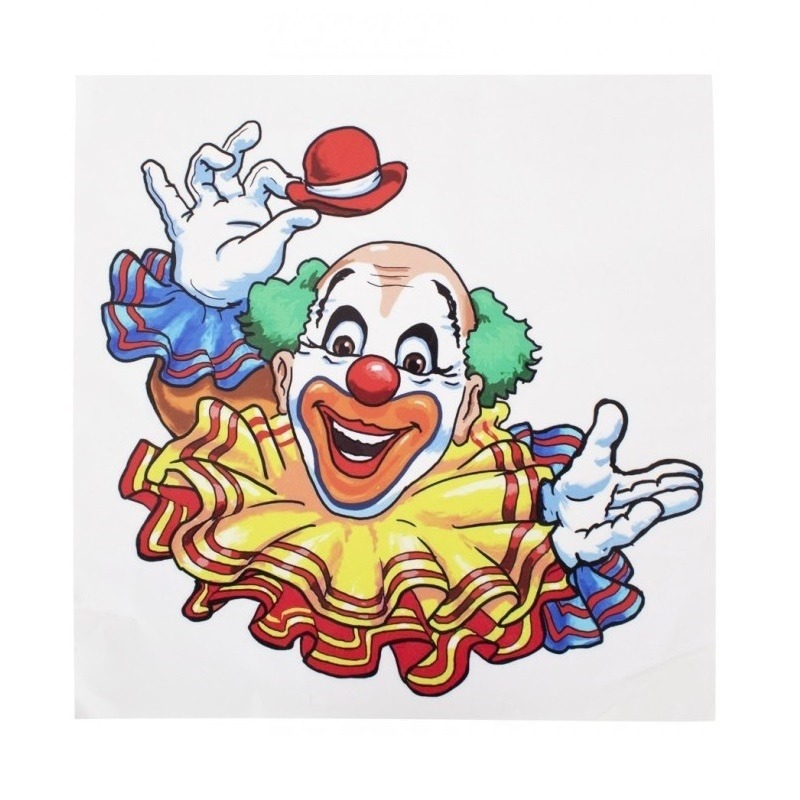 Raamsticker met een lachende clown 35 x 40 cm. Op de raamsticker staat een vrolijke lachende clown die zijn hoed optilt. Leuke carnaval/themafeest decoratie. De raamsticker heeft een formaat van ongeveer 35 x 40 cm. Carnaval clown thema feestdecoratie.