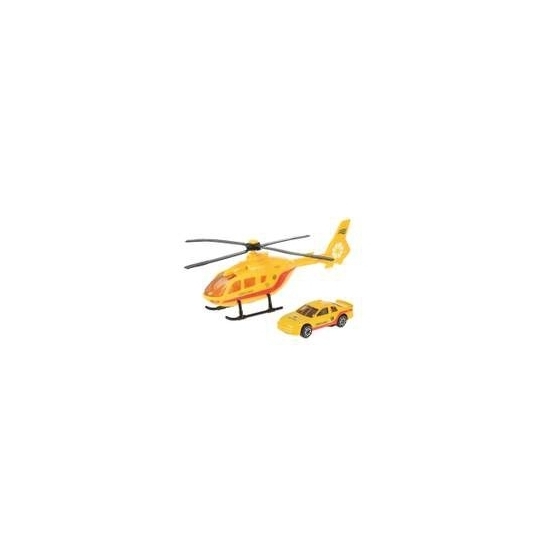 Ambulance reddingsteam speelset bestaande uit een gele helikopter en gele auto. De speelset is gemaakt van metaal en plastic.