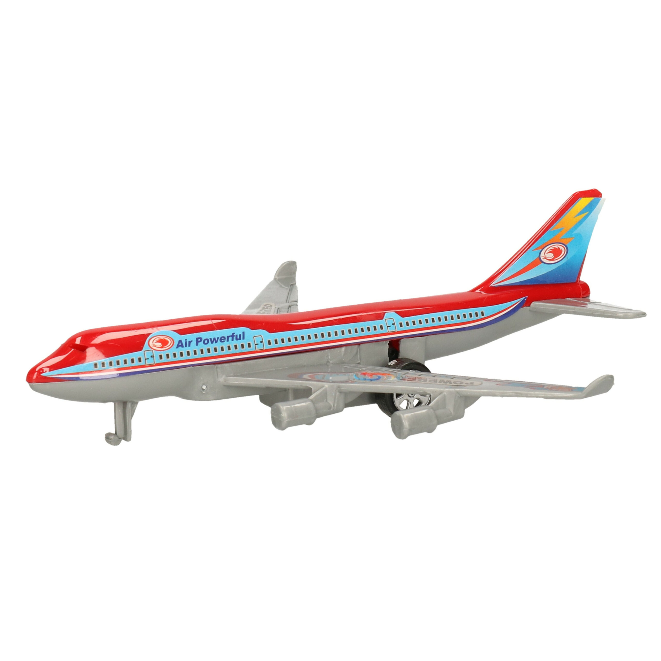 Rood/wit speelgoed vliegtuig met pull-back functie 14 cm. Een speelgoed vliegtuigje met draaibare wielen. Zet het vliegtuig op de grond, trek deze duwend naar achter en laat los. Het vliegtuig zal nu naar voren schieten.