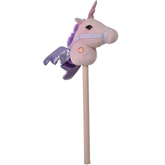 Roze eenhoorn stokpaardje met geluid 68 cm voor kinderen. Roze stokpaard pegasus pony/eenhoorntje met hoorn, vleugels en lila paarse manen en met geluid (galopperen).