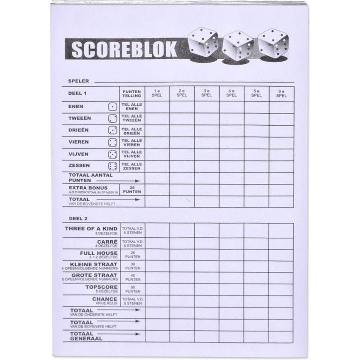 Scoreblok Yahtzee blok 100 vellen waar u uw punten op in kan vullen. Formaat: ongeveer 15 x 10,5 cm. Scoreblok om uw punten bij te houden met het spelletje Yahtzee. Taal: Nederlands. Let op: dit is geen speelgoed en niet geschikt voor kinderen.