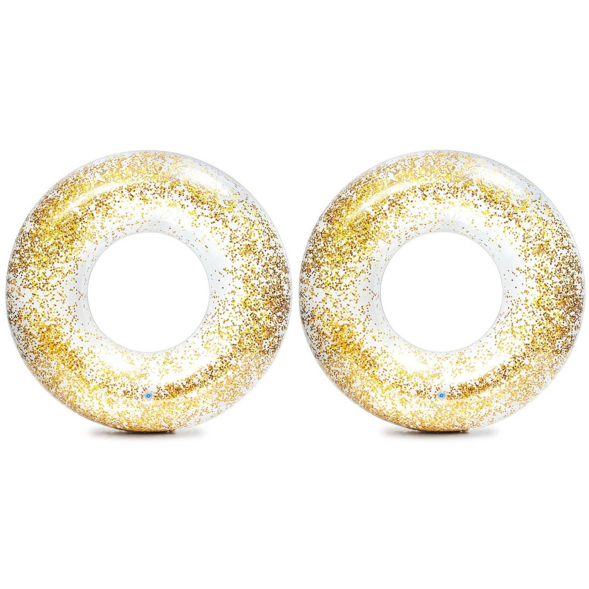 Set van 2x stuks intex opblaasbare gouden glitter zwembanden/zwemringen transparant 107 cm. 2x transparante zwembanden van stevig vinyl, met gouden glitters erin. De zwemband heeft een diameter van ca. 107 cm wanneer deze opgeblazen is. Inclusief reparatiesetje.