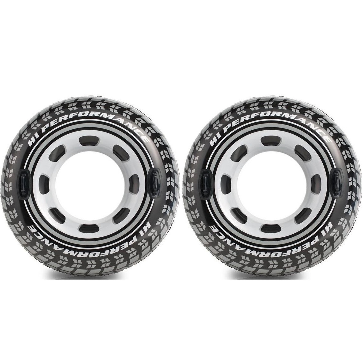Set van 2x stuks opblaasbare grote autoband zwembanden 114 cm. 2x grote zwart/grijze autoband zwemband van stevig vinyl, met twee handgrepen/handvatten. De zwemband heeft een afmeting van ca. D114 x 30 cm wanneer deze opgeblazen is. Incl. reparatiesetje. Met Nederlandse gebruiksaanwijzing. Voldoet aan de keurmerk/veiligheidsnorm, CE gekeurd en getest.