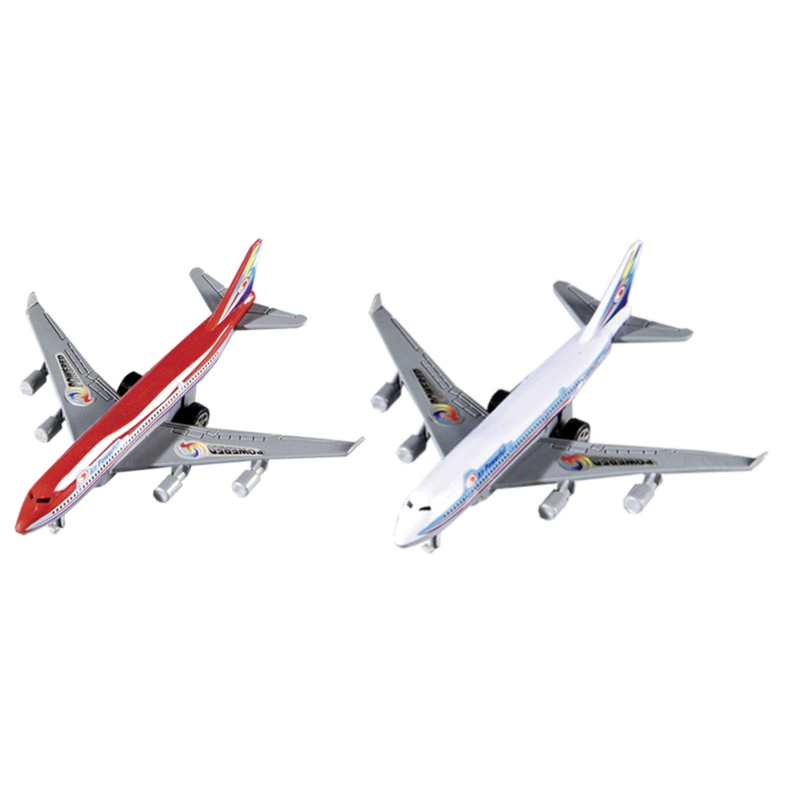 Set van 2x stuks speelgoed vliegtuigjes van 14 cm. U ontvangt 2x verschillende kleuren. Begin met het starten van je eigen vliegveld. Eindeloos speelplezier. Vliegtuigen met draaibare wielen en pullback functie. Zet het vliegtuig op de grond, trek deze duwend naar achter en laat los. Het vliegtuig zal nu naar voren schieten. Afmeting: ca. 21 x 14 x 2 cm. Materiaal: kunststof/metaal. , Dit artikel bestaat uit:, 1x Grijs/blauw speelgoed vliegtuig met pull-back functie 14 cm, 1x Rood/wit speelgoed vliegtuig met pull-back functie 14 cm