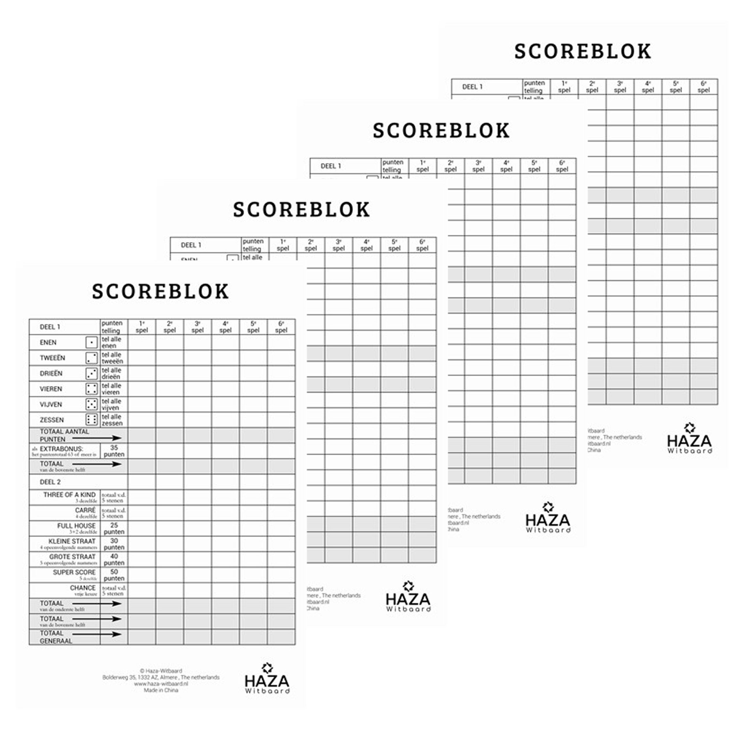 4x Scoreblok Yahtzee 250 vellen. Scoreblok om uw punten bij te houden met het dobbel spelletje Yahtzee. Dit blok bevat 250 velletjes en heeft een formaat van ca. 9,4 x 14,5 cm. Materiaal: papier.