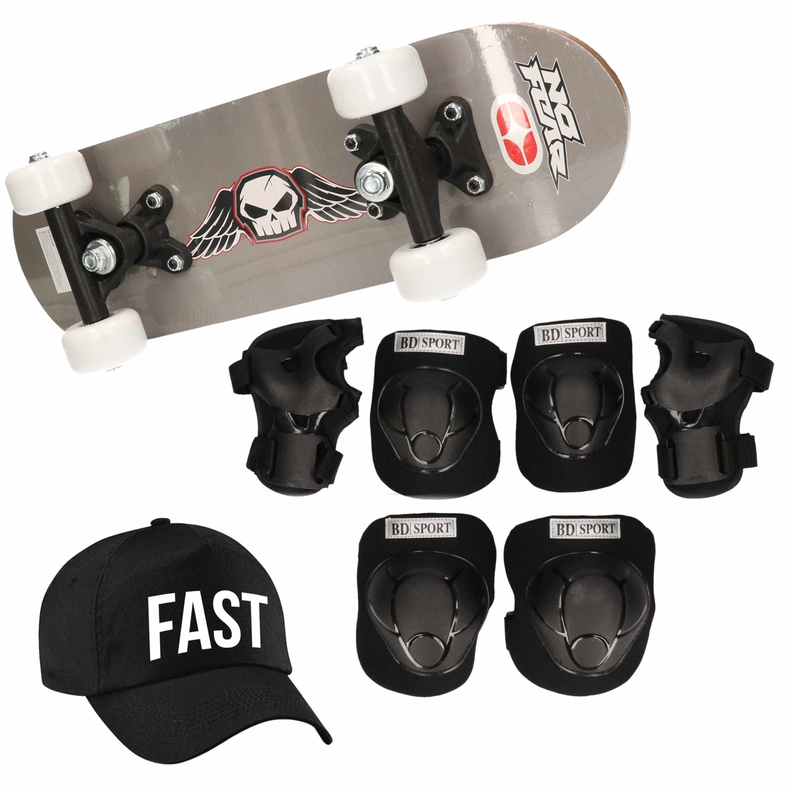 Fast pet zwart voor meisjes en jongens. Stoere pet zwart voor hele snelle kinderen, zoals stoere skaters, steppers of fietsers. Op deze baseball cap staat in het wit de tekst: FAST. Materiaal: 65% polyester / 35% katoen. Klittenbandsluiting. , Dit artikel bestaat uit:, 1x Skateboard met print 43 cm, 1x Kniebeschermers / skate beschermset zwart voor kinderen maat L – 9 tot 10 jaar, 1x Fast pet zwart voor kinderen