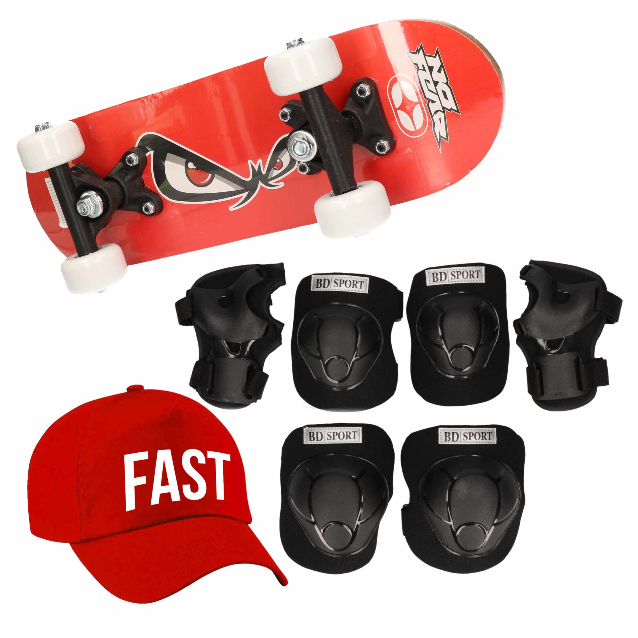 , Dit artikel bestaat uit:, 1x Skateboard met print 43 cm, 1x Kniebeschermers / skate beschermset zwart voor kinderen maat L – 9 tot 10 jaar, 1x Fast pet rood voor kinderen