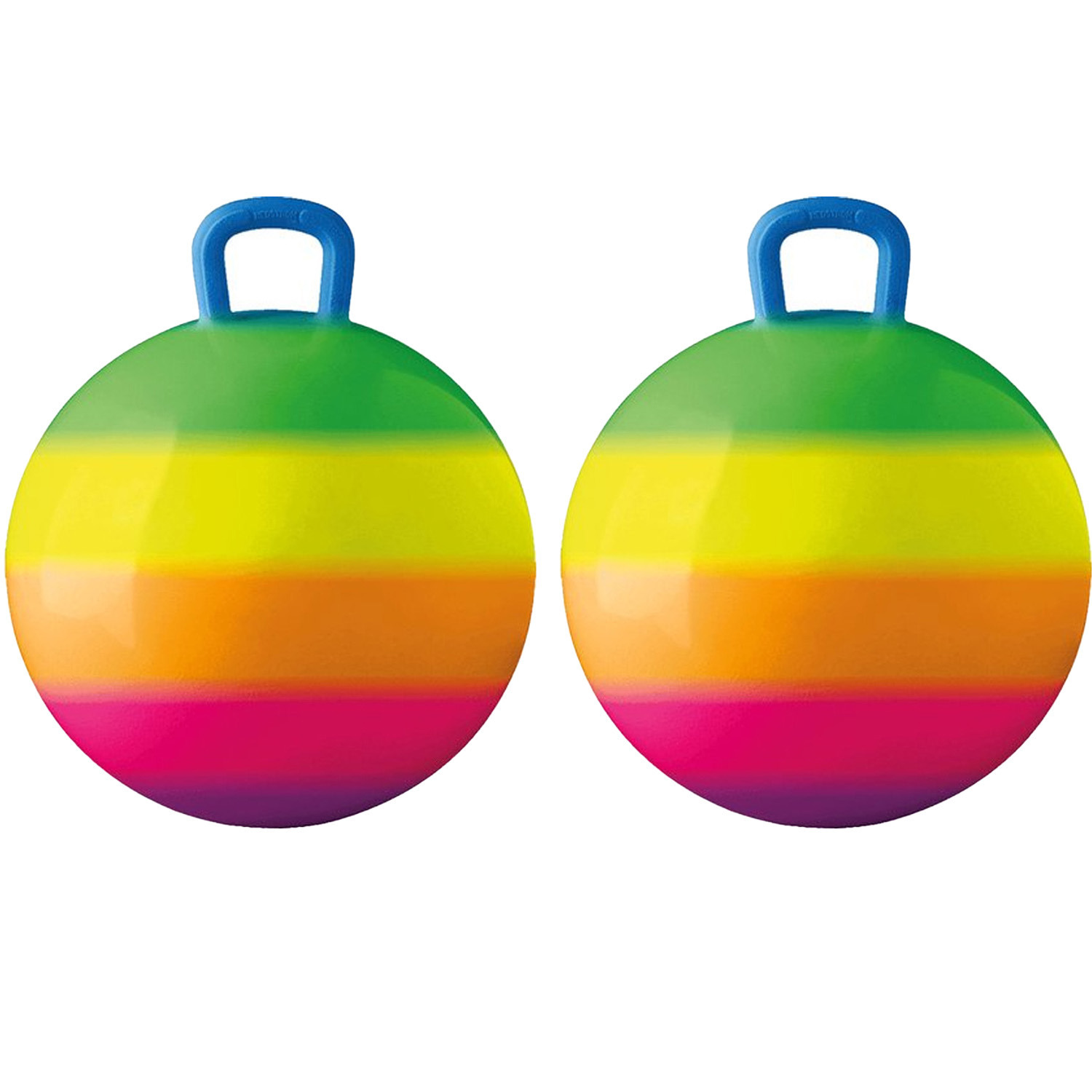 2x skippybal regenboog 50 cm. Grote skippybal in het regenboog voor kinderen. De skippybal heeft een doorsnede van circa 50 cm wanneer deze opgeblazen is. Buitenspeelgoed skippyballen/springballen voor jongens/meisjes.