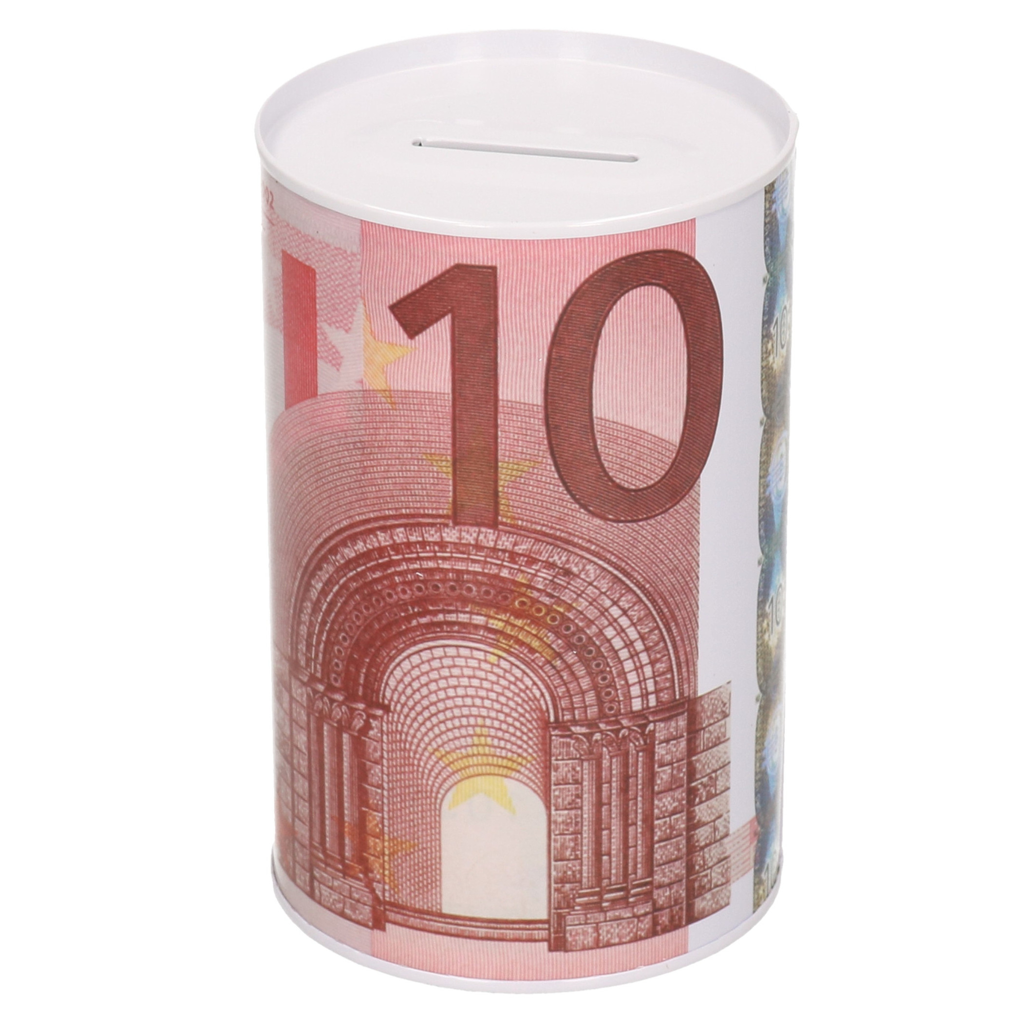 Bespaar in stijl met deze metalen spaarpot met 10 euro biljet opdruk. Ideaal om geld op te slaan en pas te openen met een blikopener.