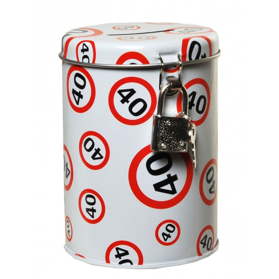Spaarpot met 40 jaar verjaardag verkeersborden prints. Een spaarpot gemaakt van metaal. De spaarpot sluit u af met een slot en is circa 11 x 8.5 cm groot.