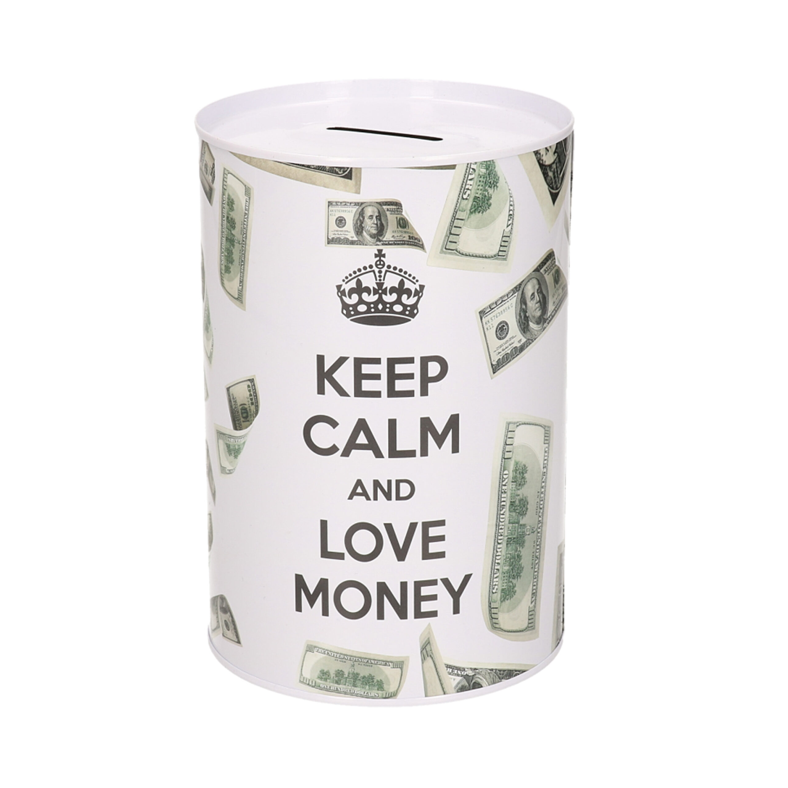 Spaarpot blik dollar biljetten 10 x 15 cm. Blikken spaarpot met de opdruk van Dollar biljetten en de tekst: Keep Calm and Love Money. Eenmalig te openen met bijvoorbeeld een blikopener. Materiaal: metaal/blik. Afmeting: ongeveer 10 x 15 cm.