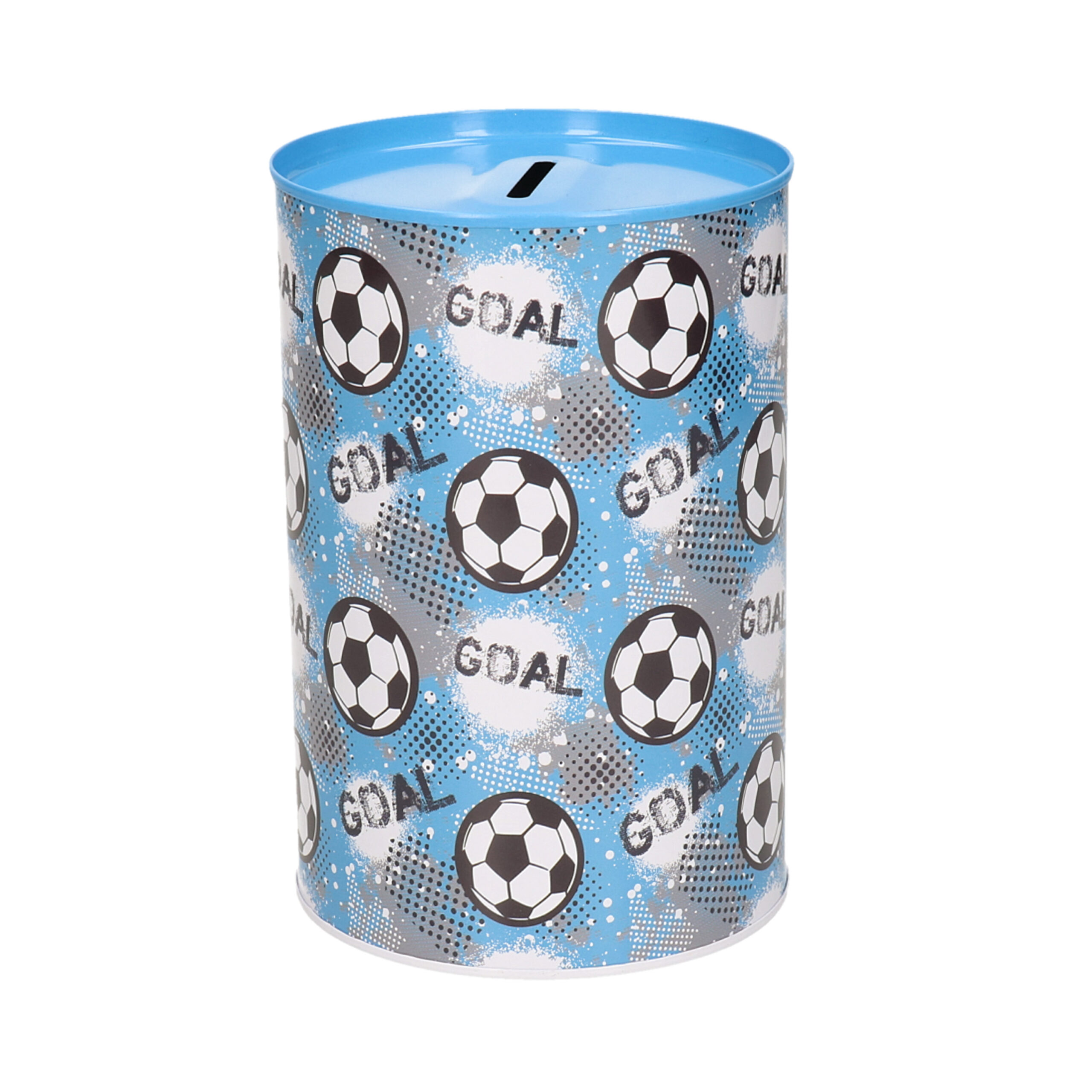 Spaarpot blik goal voetbal 10 x 15 cm. Blikken spaarpot met de opdruk van voetballen en de tekst: Goal. Eenmalig te openen met bijvoorbeeld een blikopener. Materiaal: metaal/blik. Afmeting: ongeveer 10 x 15 cm.