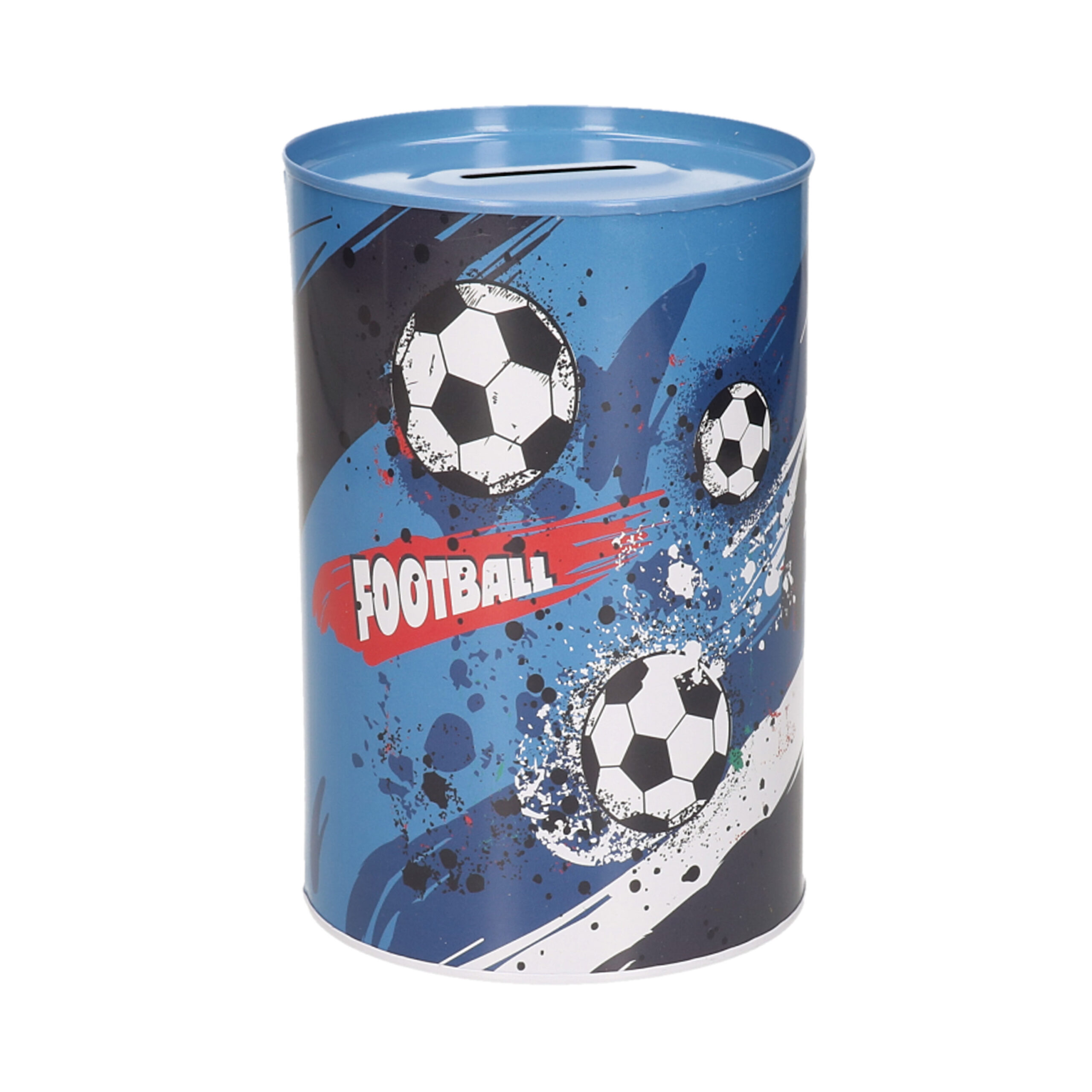 Spaarpot blik voetbal 10 x 15 cm. Blikken spaarpot met de opdruk van voetballen en de tekst: Football. Eenmalig te openen met bijvoorbeeld een blikopener. Materiaal: metaal/blik. Afmeting: ongeveer 10 x 15 cm.