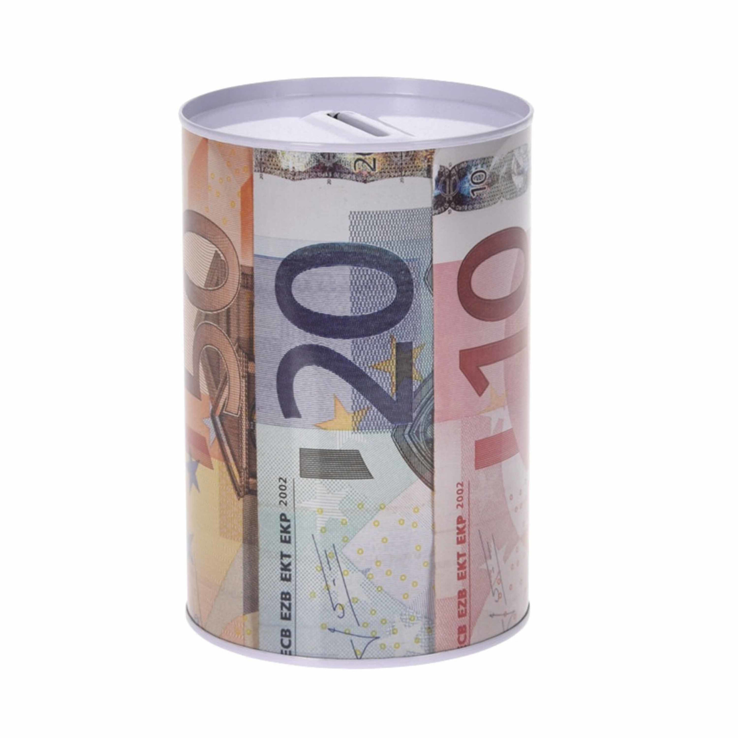 Spaarpot euro biljetten. Bewaar je geld op een leuke en veilige manier met deze blikken spaarpot met opdruk van eurobiljetten. Dankzij het stevige metaal blijft je spaargeld goed opgeborgen.