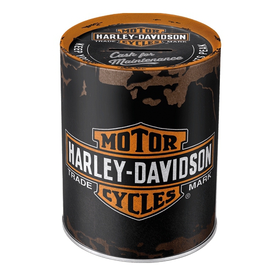 Spaarpot in Harley Davidson thema. Een ronde spaarpot voor mannen van het merk Harley Davidson. De diameter van de spaarpot is circa 10 cm en 13 cm hoog. Materiaal: blik en vervaardigd van metaal.