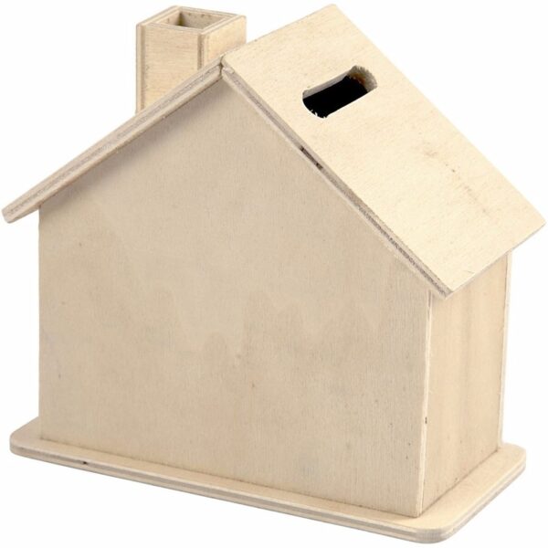 Beschilderbare hobby/knutsel spaarpot houten huisje. Dit spaarpot huisje kan naar eigen inzichten worden gedecoreerd. Het huisje heeft formaat van ongeveer 10 x 10 x 5,4 cm. Materiaal: triplex.