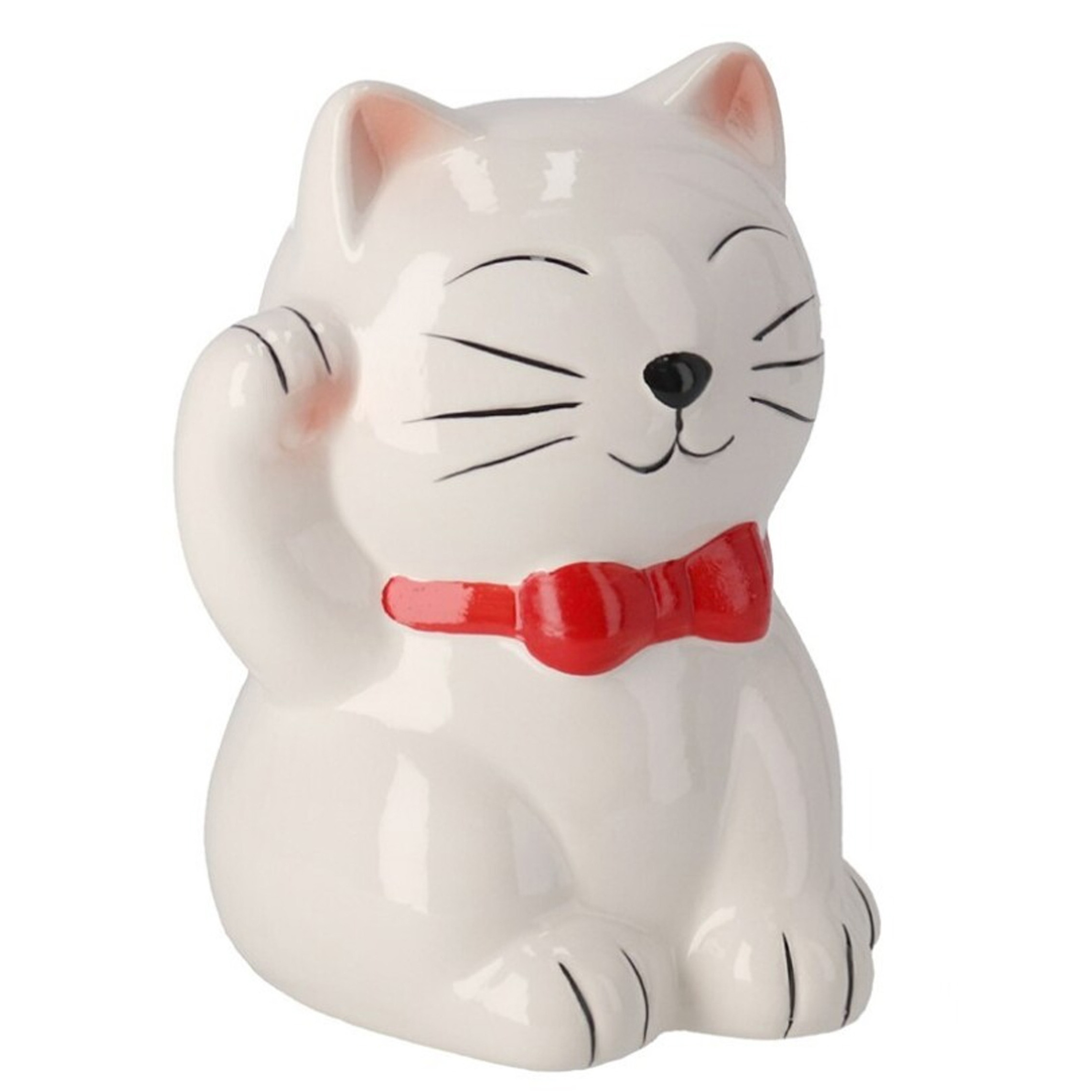 Gerimport Spaarpot kat/poes. Deze schattige spaarpot in de vorm van een kat is niet alleen een vrolijk accessoire voor de kamer, maar helpt kinderen ook leren sparen! Gemaakt van hoogwaardig porselein, heeft deze spaarpot een leuke uitstraling die elke kinderkamer opvrolijkt. Dankzij het stevige materiaal is hij zowel een decoratief item als een functioneel object. De kat met zijn speelse oogjes nodigt uit om een muntje te sparen en leert kinderen de waarde van geld en sparen, terwijl hij tegelijkertijd een leuk dierenthema toevoegt aan de kamer. De dop aan de onderkant maakt het makkelijk om je gespaarde centen weer eruit te halen! Afmeting spaarpot: ca. 13 x 14 x 17 cm.