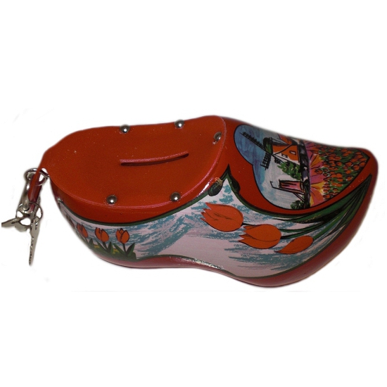 Spaarpot klomp rood. Houten rode spaarpot in de vorm van een klomp. De spaarpot klomp in traditionele kleuren word geleverd inclusief slotje om de klomp af te sluiten.