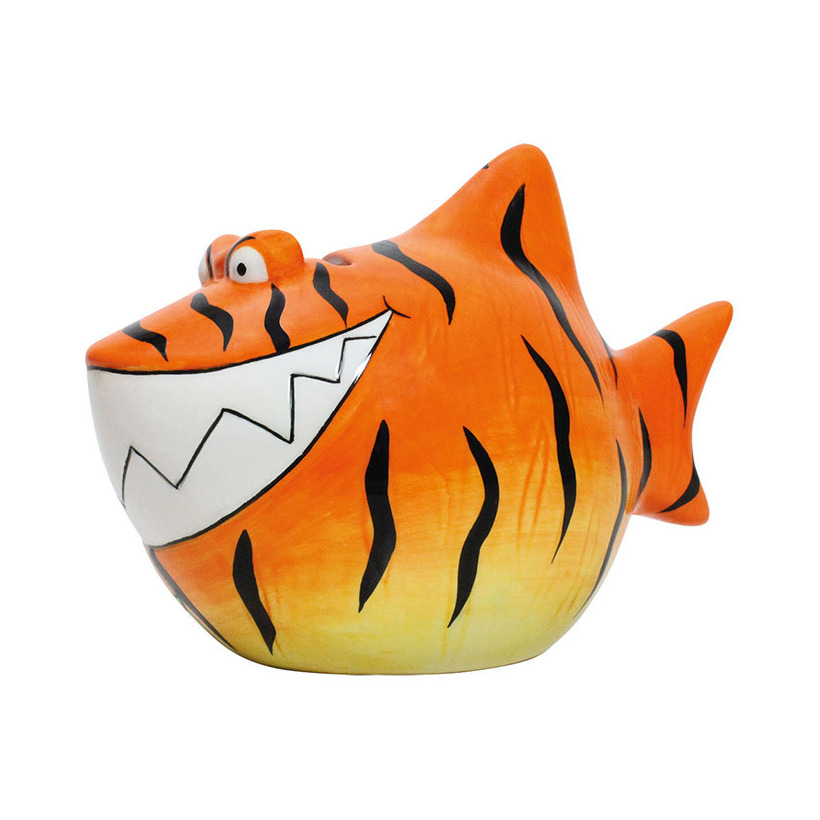 Dieren spaarpot oranje tijgerhaai 13 cm. Spaarplezier wordt leuk en leerzaam met deze oranje tijgerhaai spaarpot van aardewerk. De spaarpot is vormgegeven als een schattige tijgerhaai en heeft een compact formaat van ongeveer 13 x 11 x 7,5 cm.