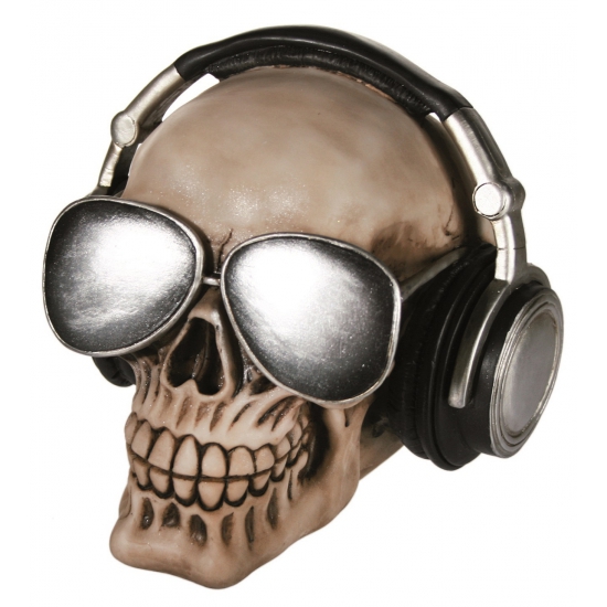Schedel spaarpot met koptelefoon. Deze spaarpot is geen saaie pot met een gleuf, maar een echte eyecatcher! De schedel met koptelefoon is stoer, opvallend en perfect voor wie net even wat anders wil. Gemaakt van polyresin en stevig genoeg om jaren mee te gaan. Of je ?m nu vult met muntjes of gewoon neerzet als decoratief stuk: deze spaarpot rockt elk interieur. Leuk voor tieners die het sparen hebben ontdekt! Een polyresin spaarpot van een schedel met koptelefoon en zonnebril. Afmeting: ca 16 x 12 cm.