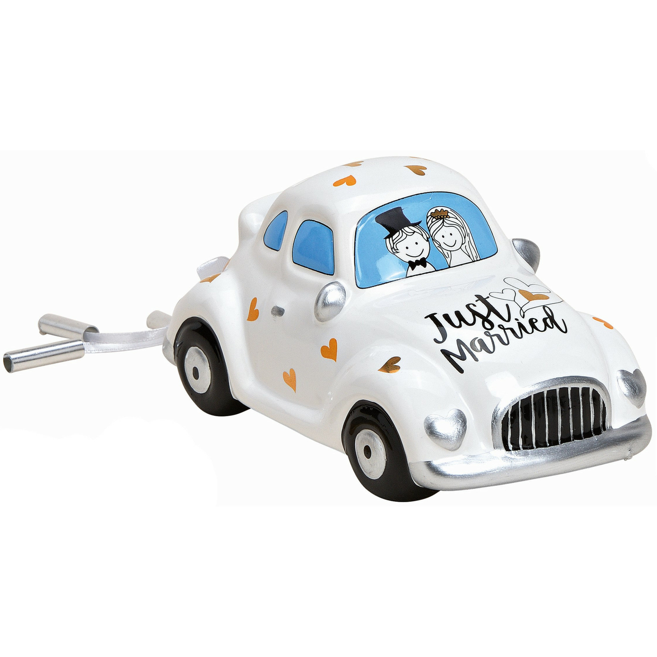 Spaarpot voor volwassenen in de vorm van een bruiloft auto met de tekst Just Married. Afmetingen: 16 x 8 cm. Gemaakt van keramiek. De spaarpot is afsluitbaar. En een super origineel kado.